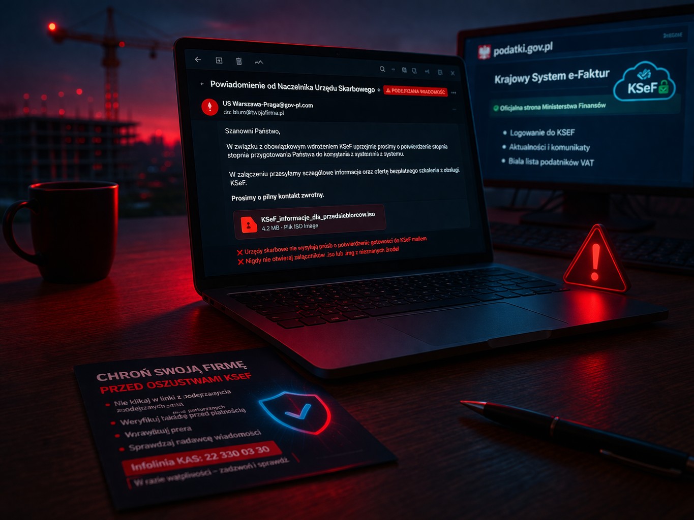 KSeF obowiązkowo funkcjonuje od początku lutego 2026 roku, a oszuści już zdążyli go wykorzystać. Zaledwie cztery dni po uruchomieniu systemu Ministerstwo Finansów wydało oficjalne ostrzeżenie przed fałszywymi wiadomościami e-mail podszywającymi się pod urzędy skarbowe. To sygnał, że digitalizacja fakturowania otwiera nowe pole do nadużyć – i że każdy przedsiębiorca musi wiedzieć, jak się przed nimi chronić.